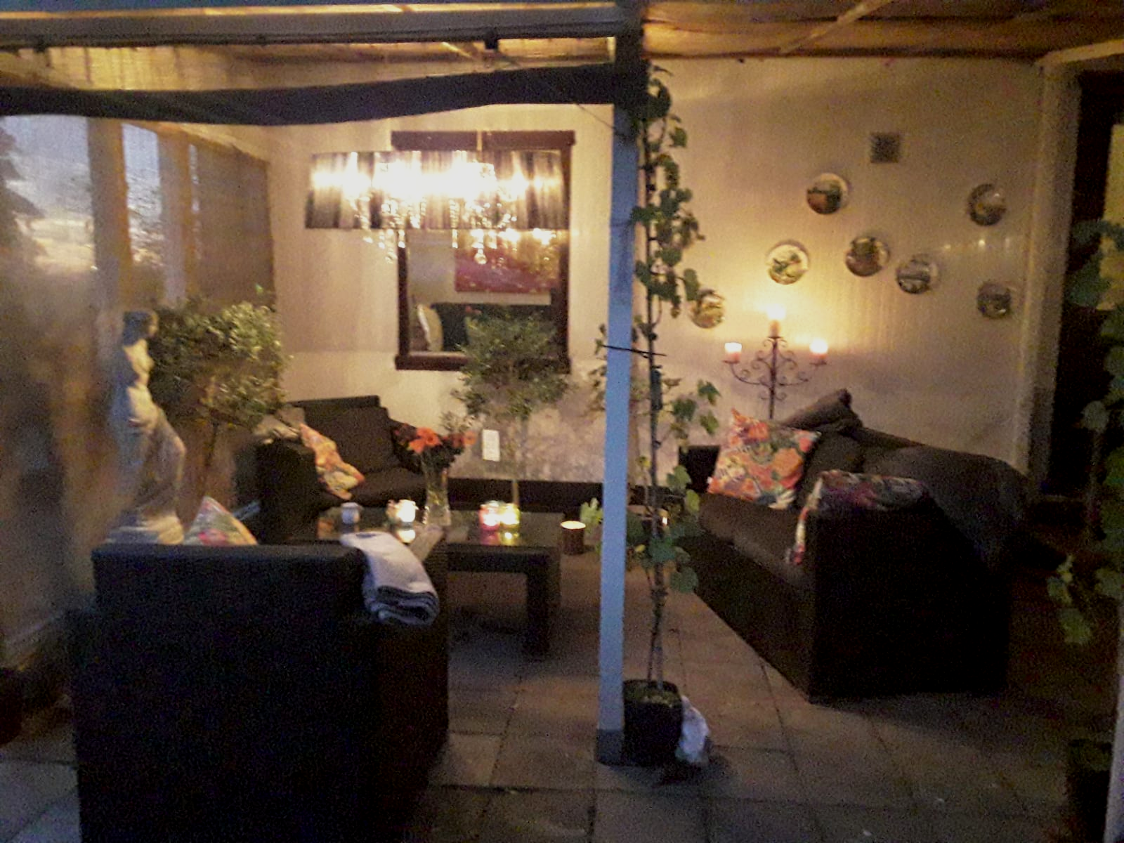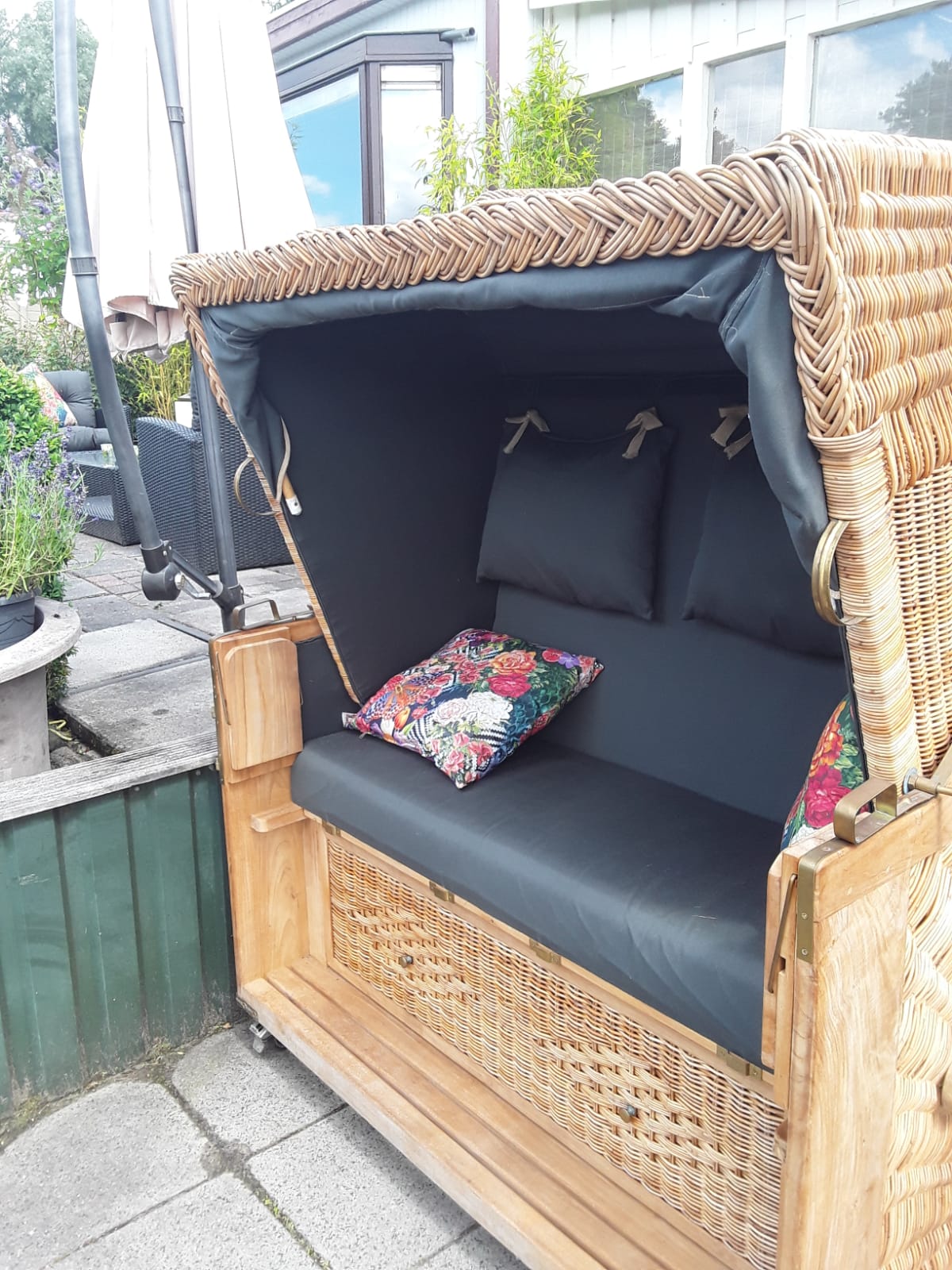 Direct aan het water staat een zalige 2 persoons luxe beklede en overkapte strandstoel, die zowel open als dicht te gebruiken is. En heeft het beneden terras ook wederom mooie sfeerverlichting.