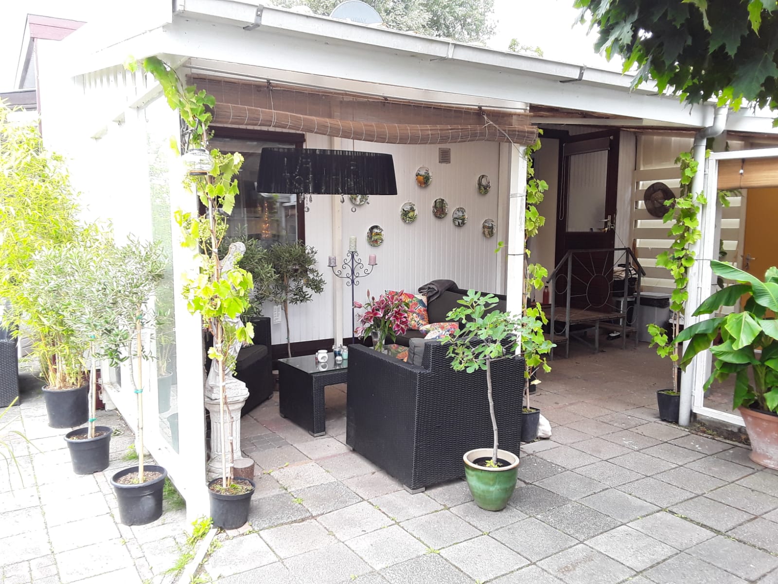 Dankzij de vele planten en bomen, waaronder olijfbomen, palmen, druivenplanten en bananenplanten, waant u zich in aangename ” mediterraanse sferen ”. Er zijn zelfs twee speciale hogere bomen die uw schaduw bieden in warme tijden.
