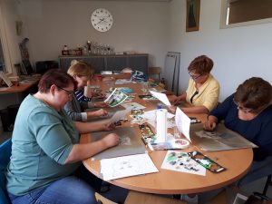 De workshop start om elf uur. Voordat we aan de slag gaan is er eerst een kopje koffie, thee of cappuccino met wat lekkers. We beginnen rustig met eenvoudige oefeningen om het materiaal een beetje te leren kennen. Daarna begint het grote werk, en leggen we de eerste hand aan ons portret van de Drentse wolf.
